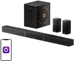 Ultimea Skywave X40 hangprojektorAz Ultimea Skywave X40 egy fejlett hangprojektor, amely minden oldalról surround hangzással teljes mozis élményt nyújt. A rendszer NEURACORE intelligens feldolgozást, vezeték nélküli hátsó hangszórókat és egy erőteljes mélynyomót használ, hogy dinamikus, tiszta hangot és mély basszust biztosítson. Erőteljes kimenet, GaN erősítés, stabil átvitel és alacsony késleltetés, valamint 4K HDR Passthrough támogatás teszik a Skywave X40-et a tökéletes berendezéssé egy egyedülálló házimozi létrehozásához. Mindezt kiegészíti a távirányítóval és az Ultimea alkalmazással történő kényelmes vezérlés, a Bluetooth-kapcsolat és a televíziók és audioforrások széles körű kompatibilitása. Mozi a nappalibanAz 5.1. 2 konfiguráció Dolby Atmos technológiával minden irányból és felülről is hanggal veszi körül Önt, így valósághű, háromdimenziós hangképet teremtve. A rendszer két felfelé irányuló hangszóróval rendelkezik, amelyek a fő sávba vannak integrálva, két vezeték nélküli hátsó surround hangszóróval és egy erőteljes 6,5 hüvelykes mélynyomóval. Ez az elrendezés lehetővé teszi a Dolby Atmos 5.1. 2 teljes potenciáljának kihasználását, tiszta térhatású effektekkel, pontos párbeszédekkel és dinamikus hangátmenetekkel – pontosan úgy, ahogyan azt a filmkészítők és a tévésorozatok alkotói szánták. Lenyűgöző technológiaA rendszer középpontjában a szabadalmaztatott NEURACORE Neural-Level Processing technológia áll, amelyet egy hárommagos DSP és egy kétmagos MCU támogat 2000 MIPS feldolgozási teljesítménnyel. Ez a fejlett többcsatornás feldolgozás rendkívül tiszta, részletgazdag és magával ragadó hangzást biztosít, függetlenül a forrásoktól – a filmektől és játékoktól a sportközvetítésekig és a zenéig. Mély basszus, amely betölti a szobátA pontos aerodinamikai hangolással rendelkező, mellékelt 6,5 hüvelykes kettős mágneses mélynyomó 35 Hz-ig képes lecsengeni a mély basszusért. A Gravus Ultra-Linear Bass technológia lineáris kúpmozgást biztosít még nagy hangerőn is, így az alacsony frekvenciák tiszták, torzításmentesek és hihetetlenül lenyűgözőek maradnak. Erőteljes teljesítmény stabil formábanA GaN erősítő technológia alkalmazásával 530 W csúcsteljesítményt értek el, miközben a hő kibocsátást 40-50%-kal csökkentették a hagyományos szilícium megoldásokhoz képest. Ez biztonságosabb, stabilabb rendszer működést jelent még hosszú, magas hangerővel történő használat esetén is. Vezeték nélküli szabadság késleltetés nélkülA szabadalmaztatott CineMesh True Wireless technológia kettős 5G sávszélességet használ az audio átvitelhez, minimalizálva az interferenciát és a hangmegszakítások kockázatát. A 20 ms alatti rendkívül alacsony késleltetés biztosítja a kép és a hang tökéletes szinkronizálását, amit különösen akkor fog értékelni, ha akciófilmeket néz vagy konzoljátékokat játszik. Készen áll a 4K HDR-reA Skywave X40 támogatja a 4K HDR Passthrough-t, így nem rontja a képminőséget, és tökéletesen illeszkedik a modern házimozi rendszerekbe. A rendszer széles körű csatlakozási kompatibilitást kínál, beleértve a HDMI eARC-t a TV-hez, a HDMI IN-t, az optikai bemenetet, az USB-t és a DC bemenetet, így biztosítva a könnyű integrációt számos eszközzel. Teljes ellenőrzés a berendezései felettA továbbfejlesztett távirányító intuitív és gyors kezelést biztosít, a dedikált Ultimea alkalmazás pedig lehetővé teszi a hangbeállítások közvetlen vezérlését okostelefonjáról. A vezeték nélküli Bluetooth 5.4 kapcsolat kényelmes zenehallgatást kínál mobil eszközökről, így a rendszer sokoldalú otthoni szórakoztatóközponttá válik. A csomag tartalmamélynyomóhangszóróhangszór